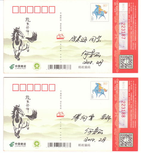 何鲁丽为陈美涵同学和付向云老师寄的明信片